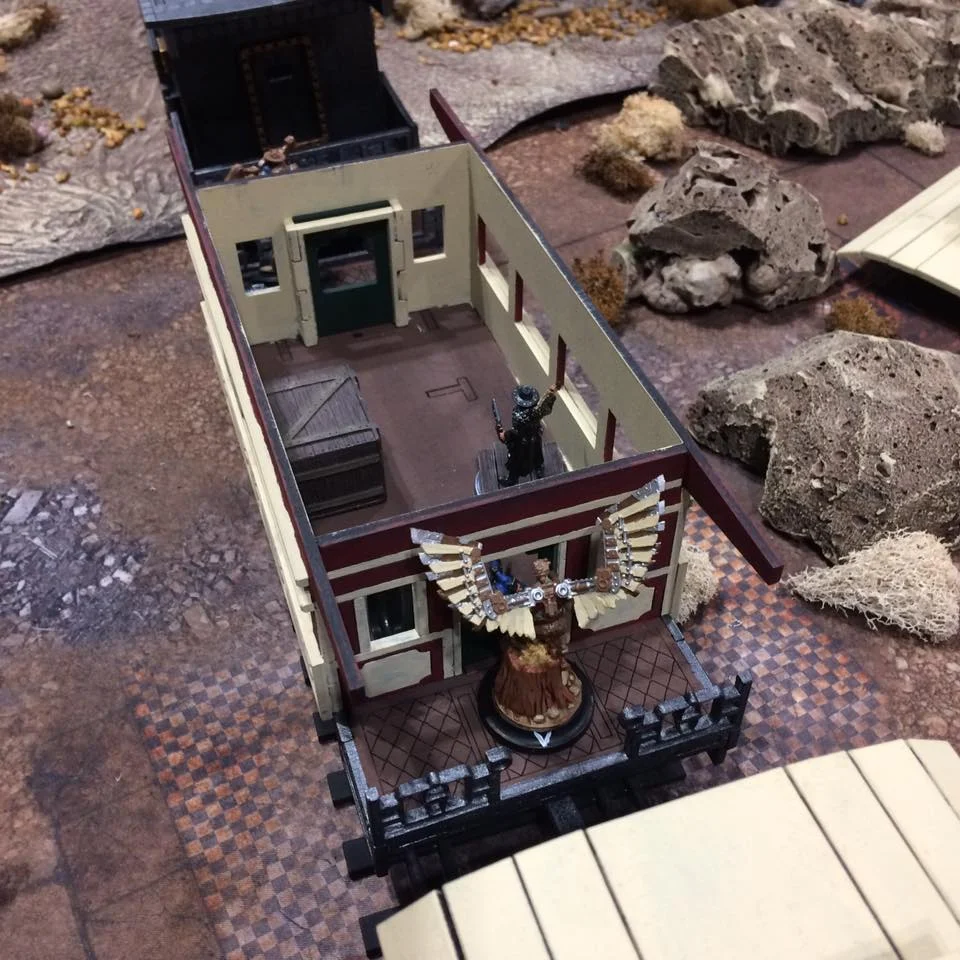 We divided once again into two teams and shared out our items from the Scavenger hunt and set our forces up along a full 24-foot table. The only way we could get on the Train was to climb up trees and buildings and then risk a jump on to the fast moving vehicle so we'd placed our forces accordingly and made our opening moves. I was extremely happy when I managed to get a Lawbot to climb a tree and jump onto a carriage with no Influence being spent - he was like a mechanical squirrel!