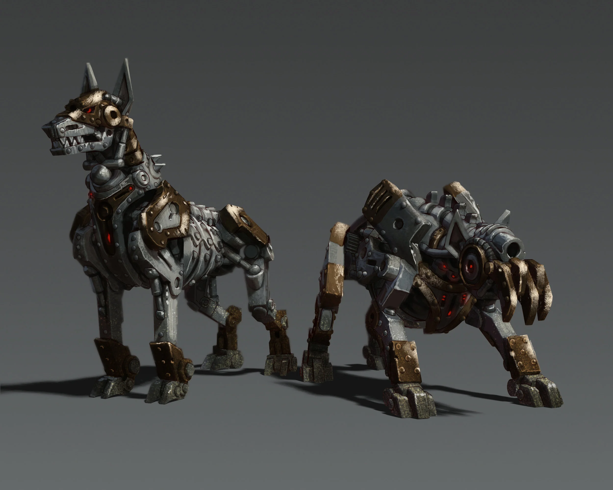 Although very early experiments with mechanical companions can be traced back to the clockwork fox created to amuse Prussian nobility through to the steam powered bulldogs who once upon a time accompanied Crown constabulary about their duties, it was the Enlightened who perfected the robotic dog by merging their own mechanical mastery with a refined RJ-1027 power source.