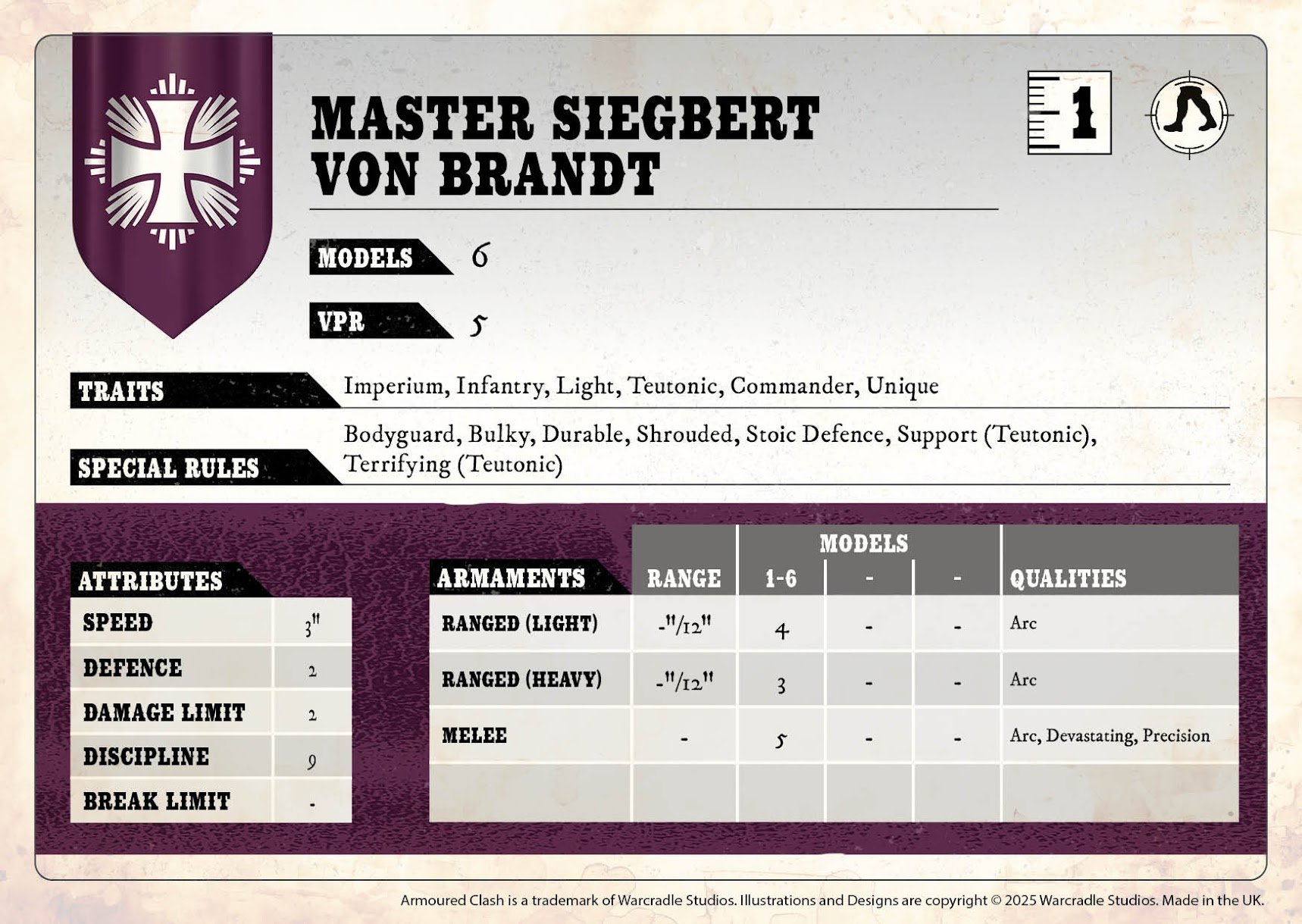 Master Siegbert von Brandt is a new, unique Commander unit that can be included in an Imperium Force to represent the leadership of the powerful, but secretive Ordo Teutonic. With an impressive Damage Limit of 2, as well as the Durable and Shrouded special rule, this formidable staying power allows an Imperium General to send this unit forward with little risk of losing it to a lucky opening volley