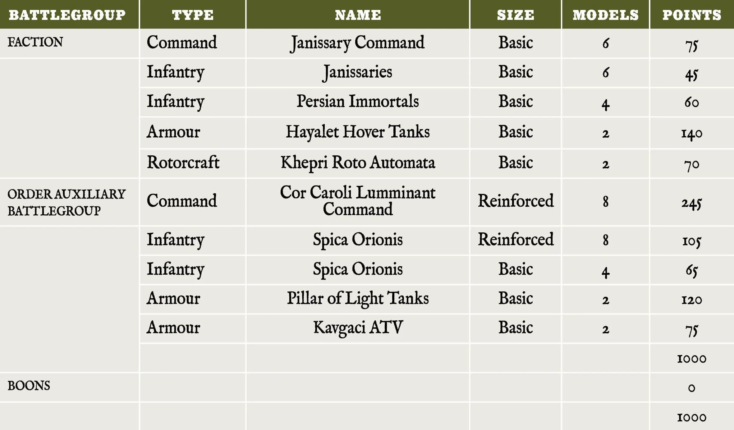 Below is a sample 1000-point Sultanate list that brings together the above units. With two Battlegroups, you get access to both Commander Bonuses. These will allow you to manage your Command & Conquest deck to enable the best use of your portals. The multiple Infantry units are ideal for either hit-and-run attacks through the portals or for grabbing Strategic Objective Markers. The Hayalet and Pillar of Light Hover Tanks provide a solid armoured punch, backed by the fast-moving Kavgaci ATV and Khepri Rotor Automata.