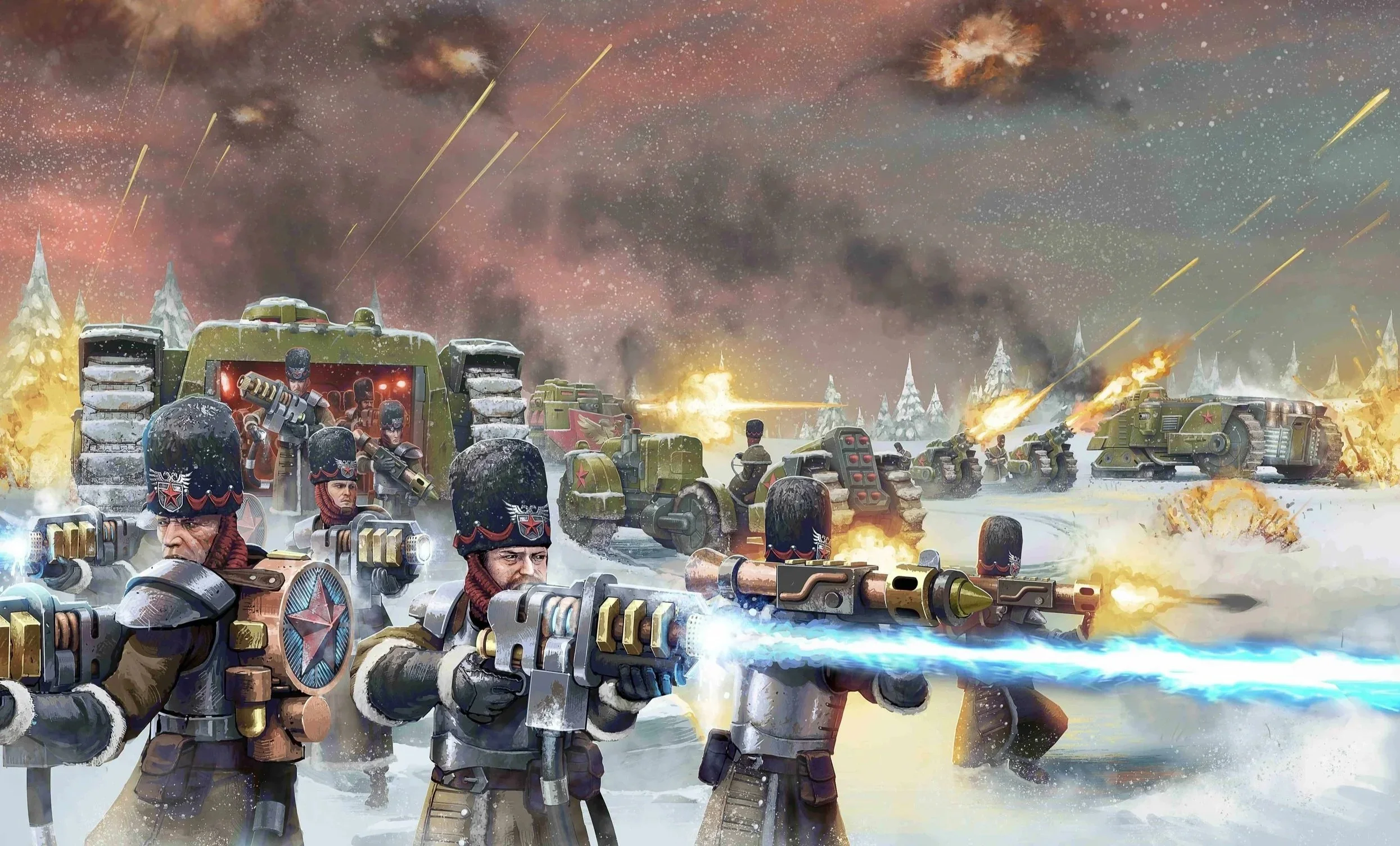 The frontal protection of the Omsk Cryo Transport and the Matryona Heavy Transport has also raised some eyebrows, considering they are as tough as the Crown’s Galahad Main Battle Tanks. This was intentional. The Galahad was a benchmark for the Commonwealth Engineers to reach; such was the determination to make a large, survivable transport for their infantry. For those who haven’t seen the models yet, both of these transports are quite impressively proportioned and well deserving of their toughness. Both versions are longer and beefier than the Tsar Battle Tank, and also longer than the Galahad.