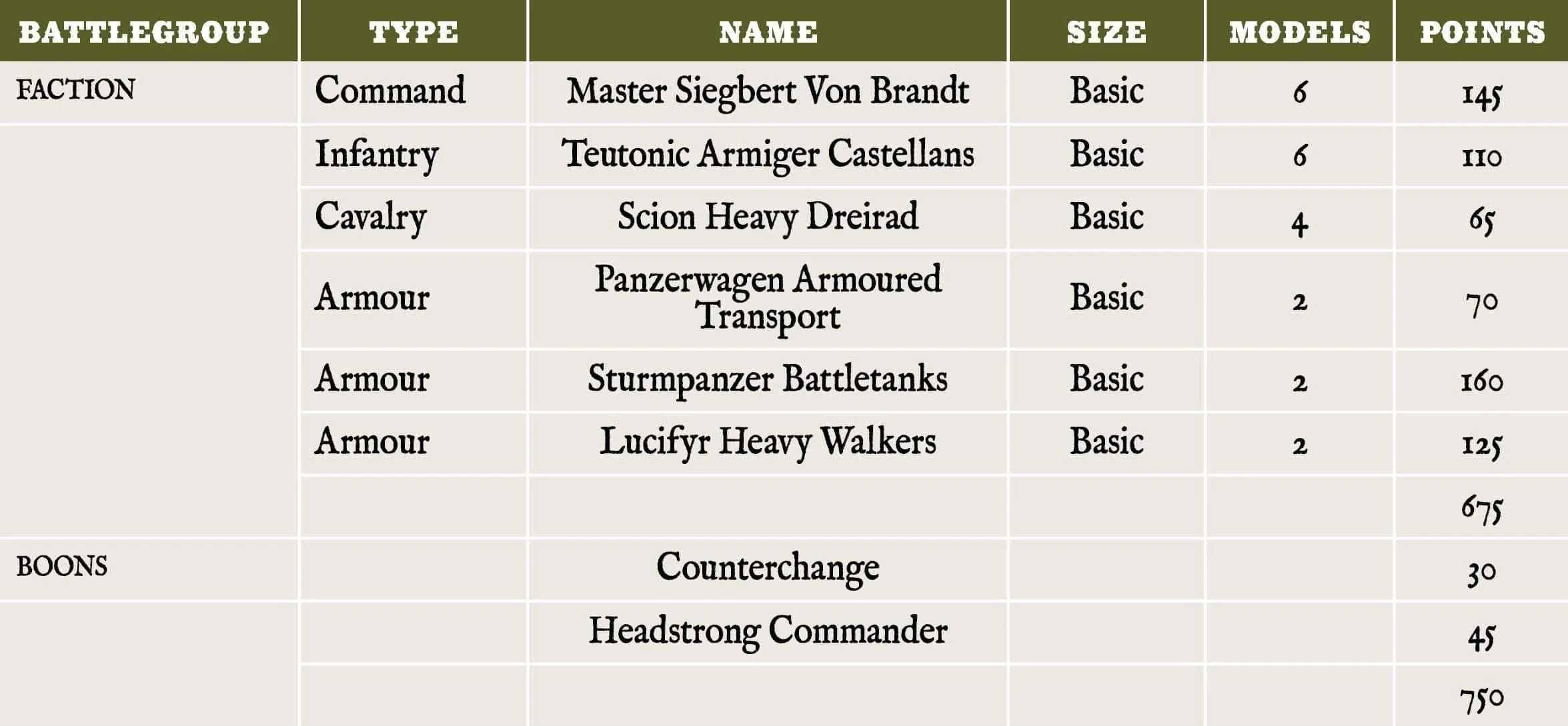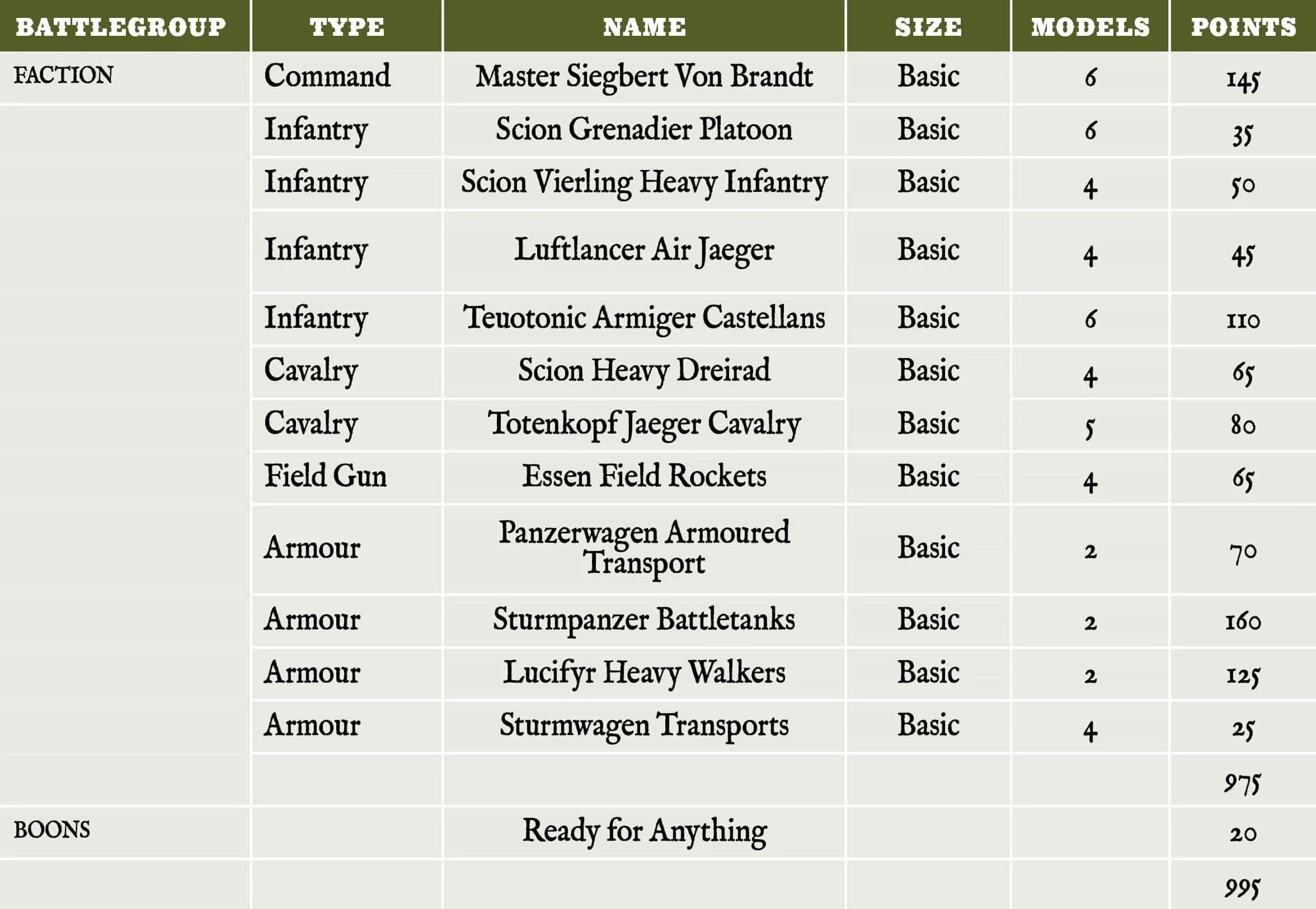 In addition to all of the units from the 750 point list, above, this force gains an infantry unit of every type available to the Imperium. The reliable Scion Grenadier Platoon should form the centre of your battleline, while Scion Vierling Heavy Infantry are excellent at keeping any enemy infantry and cavalry that your opponent may use to claim your objectives off you.