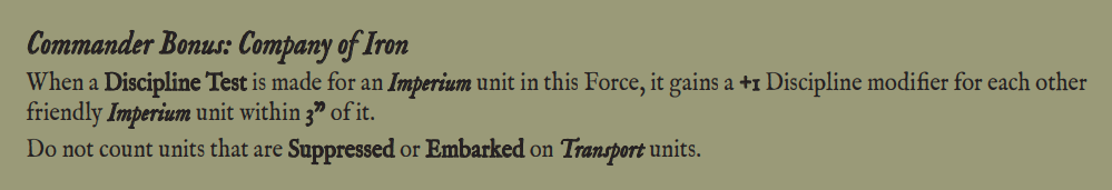 Now you have your ORBAT, start with the Imperium’s faction Battlegroup. This will give you the minimum and maximum values for each available unit type. By belonging to a Battlegroup your units get access to a unique Commander Bonus that will give your force an edge in battle: in this case, any of your units that are close to each other boost each other’s morale values.