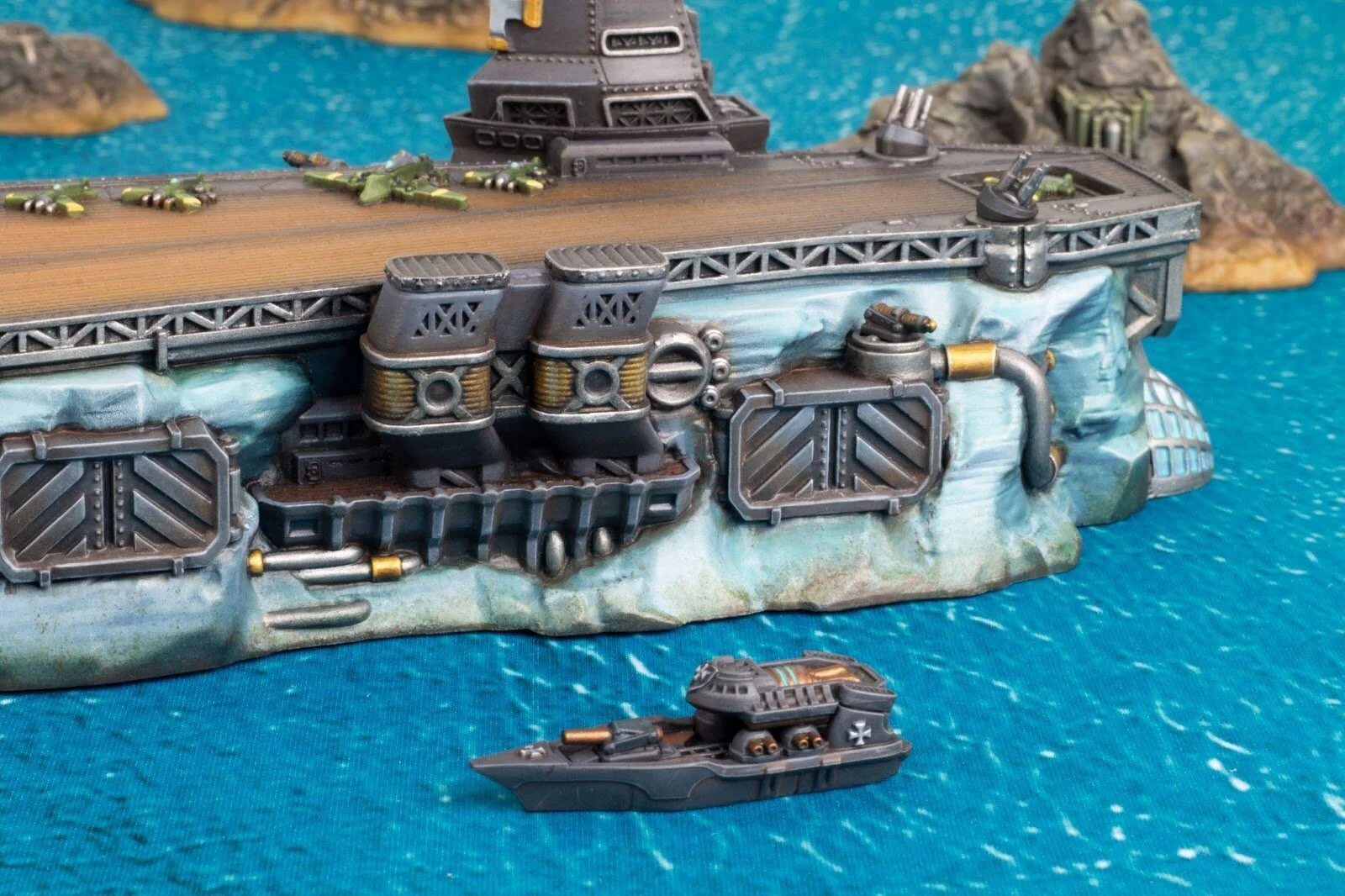 Without any upgrades, the “basic” Ice Maiden unit comes in at 500 pts. At first glance, this will probably unnerve a few people, but considering a Templehof Carrier is 240 and a Kaiser is 280, when you start to compare the stats and special rules of the Ice Maiden against other models, you will see that 500 is a reason to take the Ice Maiden. For one it has the same carry capacity as the Fleet carrier (eight aircraft per turn) and can launch more special SRS a turn (four in total). It also brings more firepower than the Templehof Carrier and the Kaiser combined. The named Ice Maiden models are more expensive (at 530 for the Eiskalte Schoenheit and 600 for the Prinzessin Wilhelmina but this is offset with more firepower and (for me in respect of the Prinzessin Wilhelmina) a completely different role while also keeping the airpower complement.