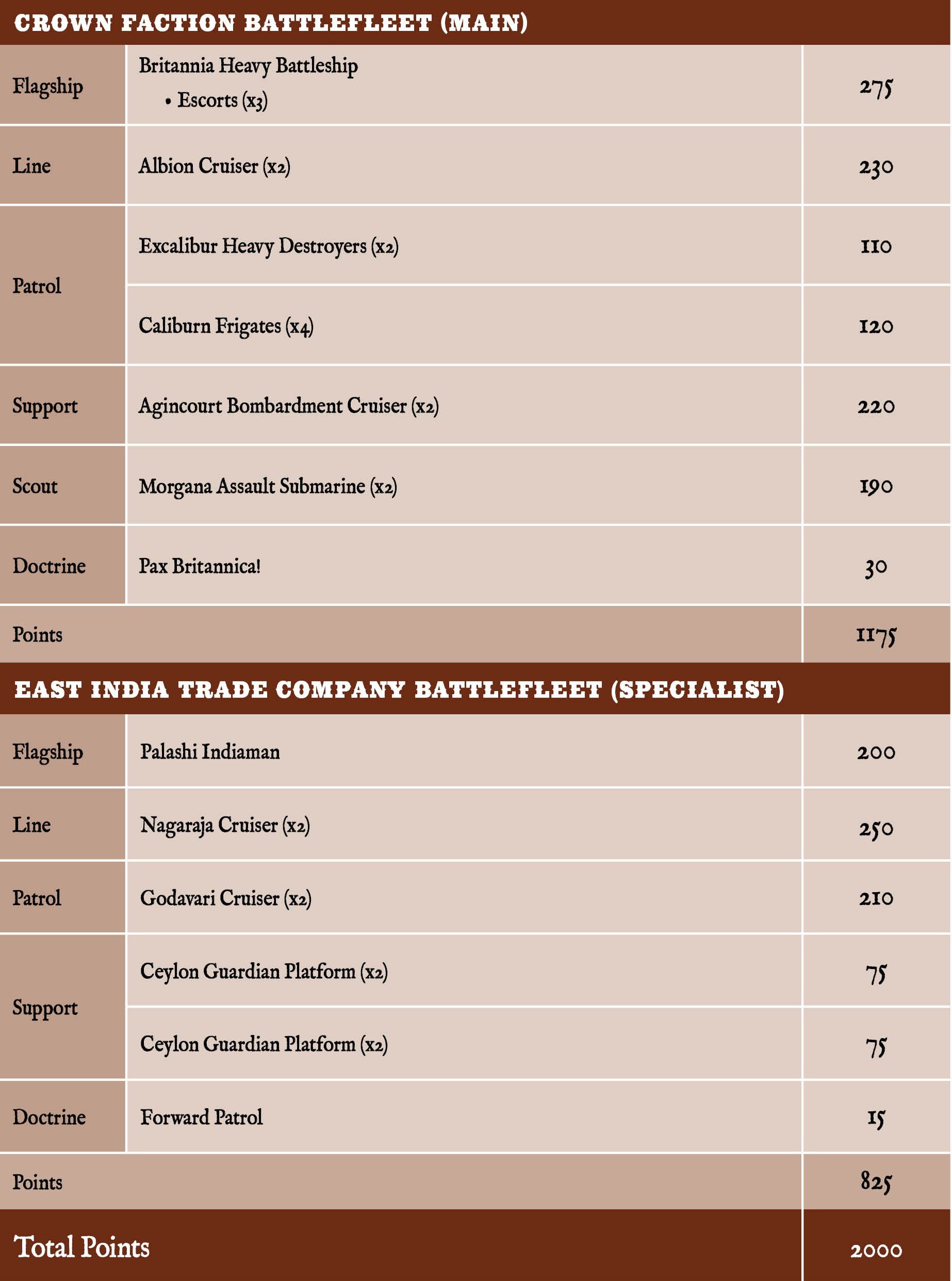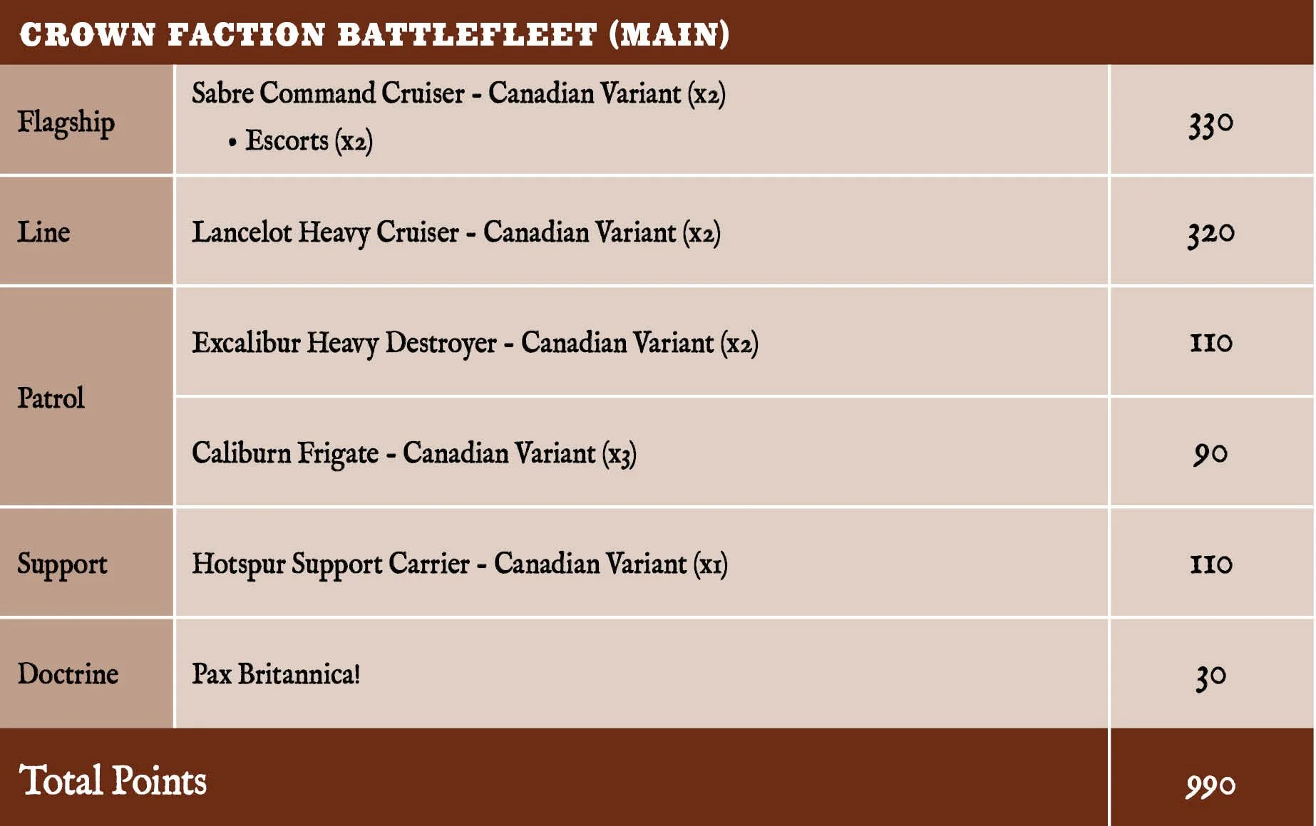 This is a perfect beginner Force as it uses just the Crown Starter Set and a single box of Crown Frontline Squadrons. It fulfils the appropriate choices for the Faction Battlefleet so you get the Lionhearted Crew bonus as mentioned before.
