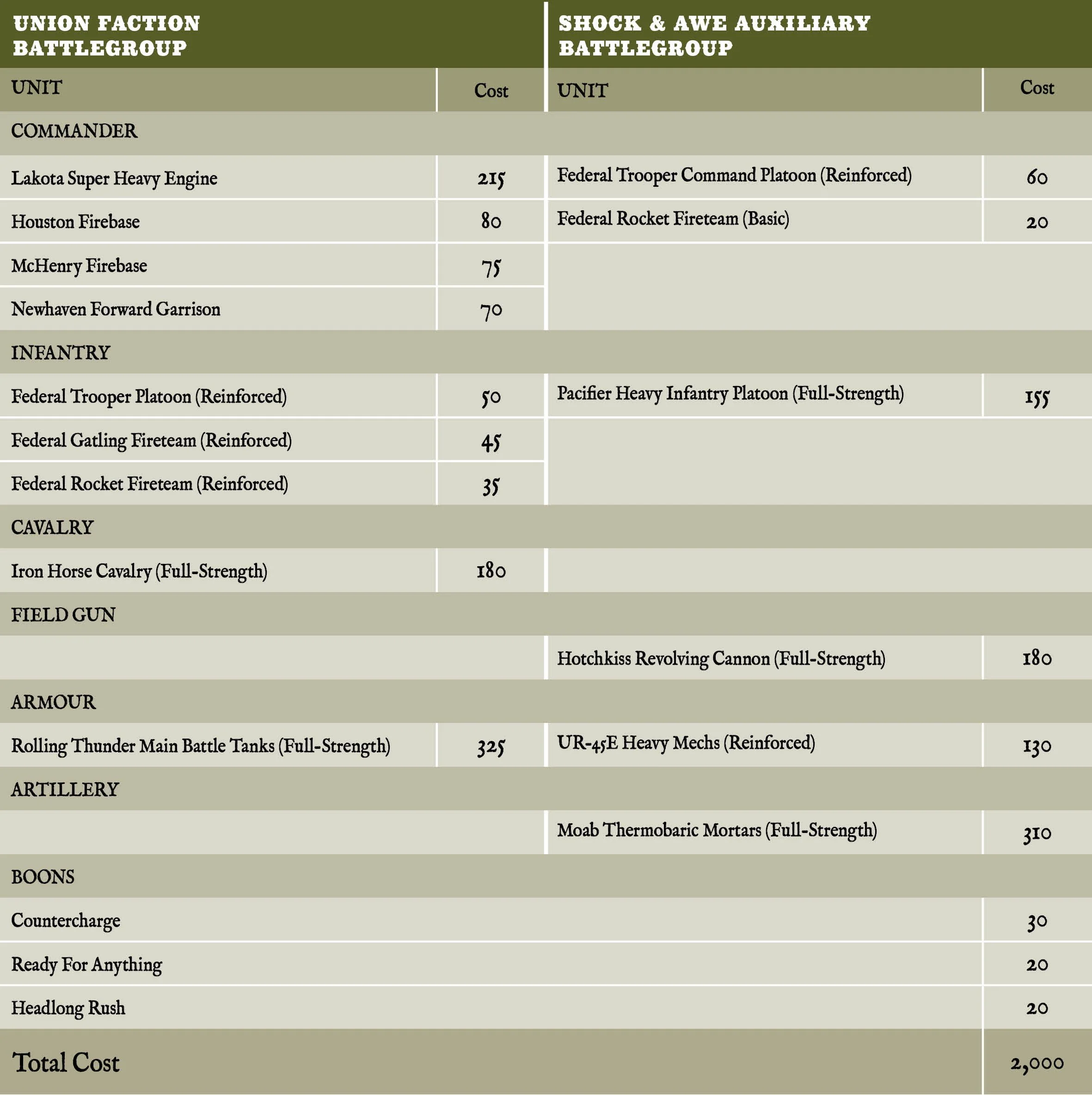 All Union Forces contain at least one Union Faction Battlegroup. This Battlegroup allows you to Bolster a single unit of Cavalry and a single unit of Armour, a combination that means that even relatively small Union Forces can amass impressive quantities of Iron-Horse-riding soldiery and fleets of battle tanks, transports, and battle-automata.