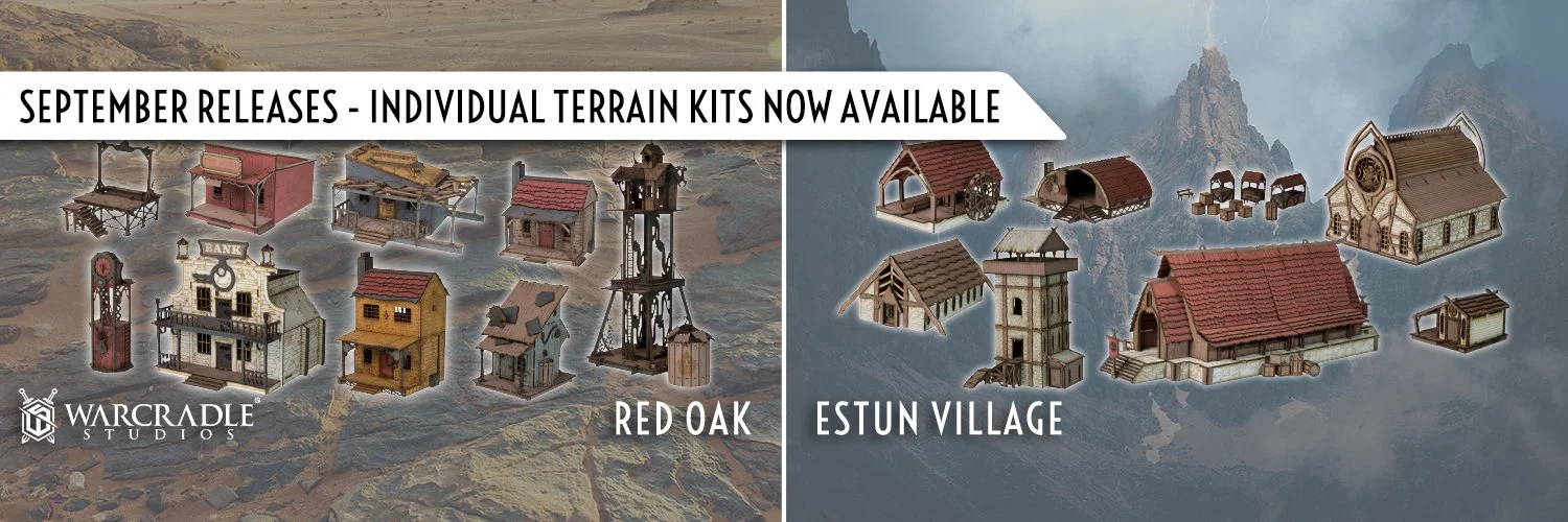 This month the Red Oak Town Set 2 and Estun Village Set will be available as separate terrain kits. Now that they are being offered as individual kits you can outfit your Red Oak Town or Estun Village as you envision it.