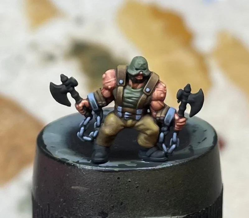 Step 1: Due to the multi-layered nature of the Berserker, I decided to basecoat the largest areas of the model before fully diving into each element. I painted the skin first using Tan, then the vest using Yellow Olive, and finally the trousers using a 75/25 mix of Flat Earth/Camouflage Green.