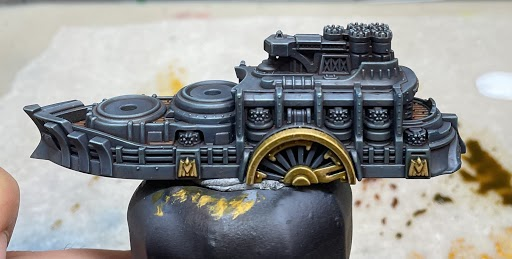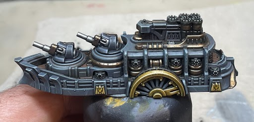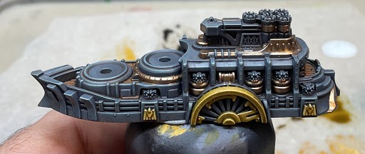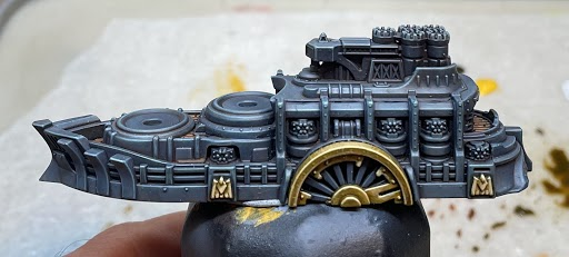 Step 9 - I decided to use a mixture of True Metallic Metal (TMM) and Non Metallic Metal (NMM) techniques on the gold areas due to the scale of the model. Needing to knock the “glittery” effect of the TMM back a little, my base coat was a 50/50 mix of Gold and Orange Yellow (P3 Rhulic Gold/Meaty Ochre). To get a solid coat I repeated this process twice.