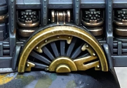 Step 14 - I washed the bronze areas with thinned down Brown Ink (Vallejo Game Ink) to deepen the tone a little and further knock back the glittery effect of the metallic paint.