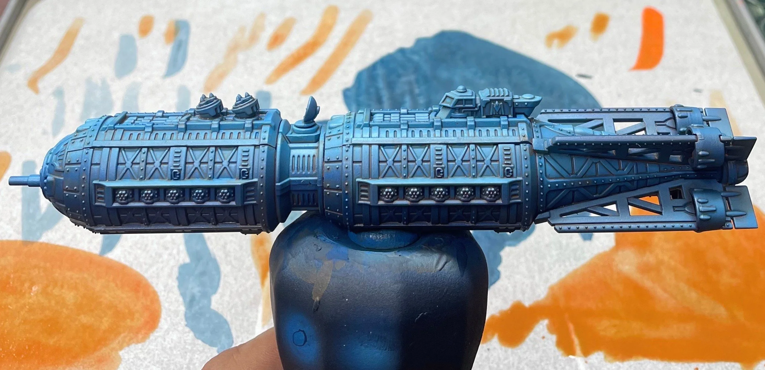 Step 1 - To start with this Excelsior, I airbrushed three layers of Exile Blue over a black undercoat over the entire hull. Any of your favourite matte black paints will work as an undercoat for this step.