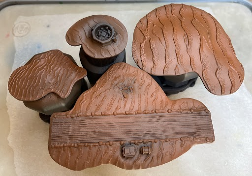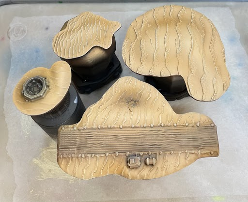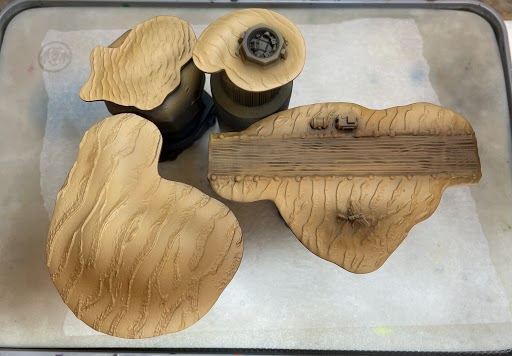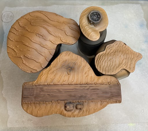 Step 2 - I gave the islands a first highlight of a lighter brown (P3 Bogrin Brown) using an airbrush. You can stipple or over brush this coat, but I prefer an airbrush for speed. I applied the highlight generously and only avoided the deepest recesses and the runway.