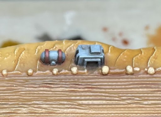 Step 9 - I added some deeper tones with watered-down chocolate brown (P3 Umbral Umber), paying attention to the recesses around details and the trail of the crashed plane.