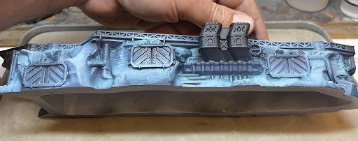 Step 12 - The ship parts were given a base coat of blue-grey (P3 Greatcoat Grey). I masked around these with Silly Putty and used an airbrush to speed up the process.